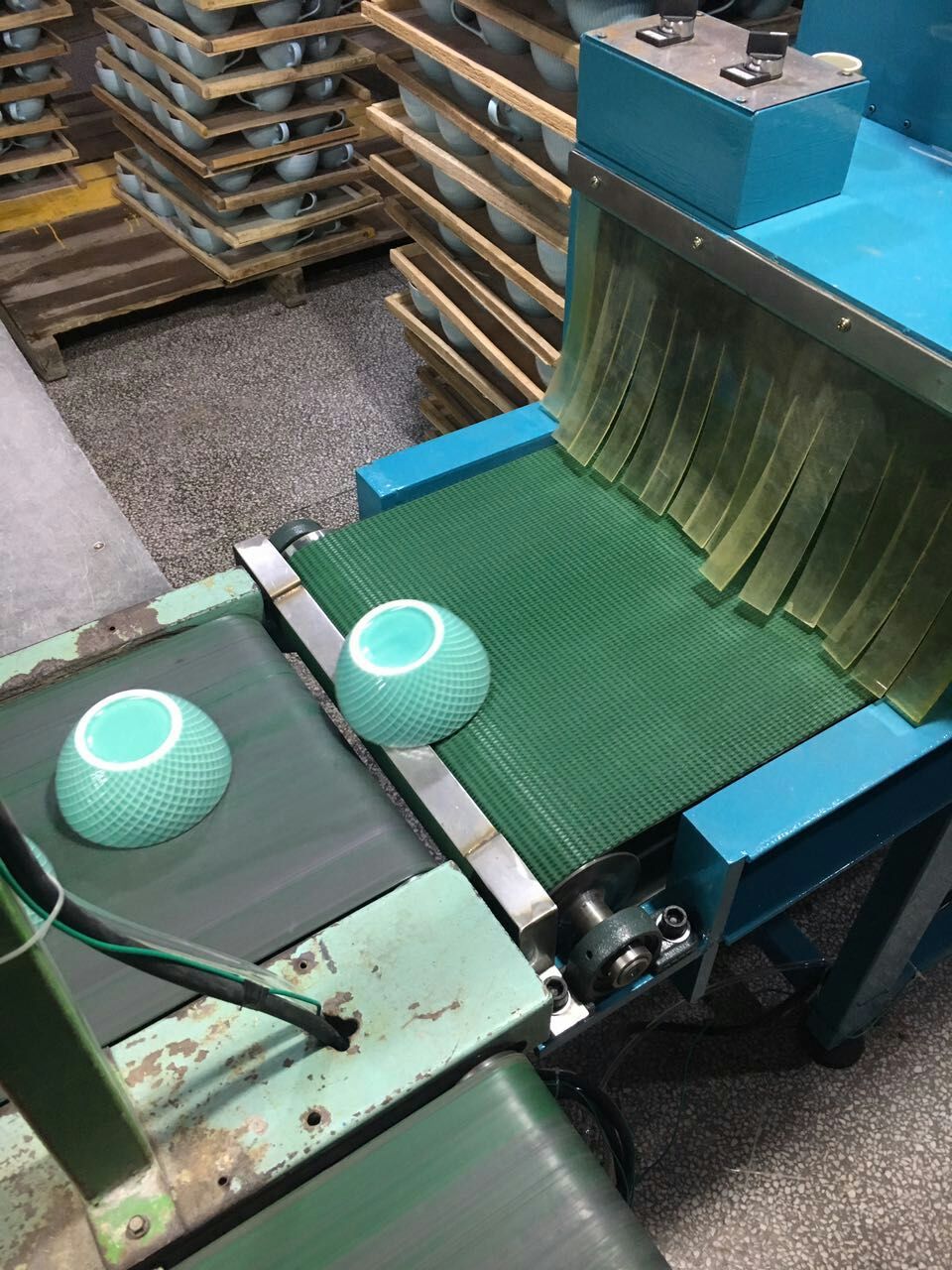 優(yōu)點(diǎn):是與窯爐出口處連接,用于燒制后窯具的殘留物會(huì)與陶瓷底部粘連,導(dǎo)致器具底部不平、刮手等不良現(xiàn)象的 日用陶瓷底部磨平,適應(yīng)產(chǎn)品的大小、高低,可隨意調(diào)節(jié)。機(jī)械自動(dòng)化,磨出的底部光滑平整,提高產(chǎn)品質(zhì)量。防滑皮帶傳送,防止移動(dòng),可連續(xù)工作,產(chǎn)量提高。減少勞動(dòng)力,代替工人繁重的勞動(dòng),節(jié)約成本。機(jī)身采用進(jìn)口汽車專用油漆噴涂,經(jīng)久耐用,不易銹蝕。全電,氣動(dòng)控制,操作簡單,故障率低,保養(yǎng)方便。